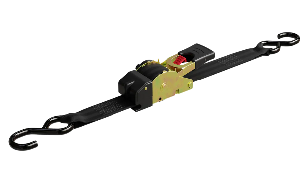 To secure, hook one end, pull strap out, and hook the second end. Press the red button to pull in any slack, and then give a few quick ratchets to tighten.