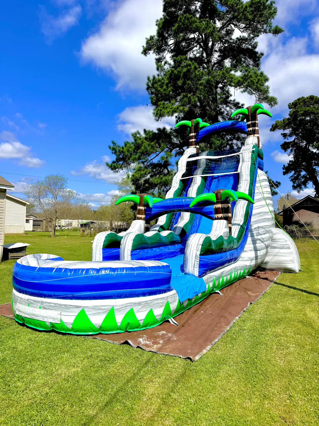 The bold tropical color scheme creates instant excitement and photographs beautifully for marketing and social media. Two wide slide lanes allow multiple riders at once, keeping lines moving and adding friendly competition and nonstop fun for all kids. Large splash pool landing areas provide a safe and refreshing finish, making this inflatable perfect for birthdays, school events, church functions, and community festivals. This water slide brings smiles, laughter, and unforgettable summer fun while offering rental businesses strong return on investment and consistent customer satisfaction.