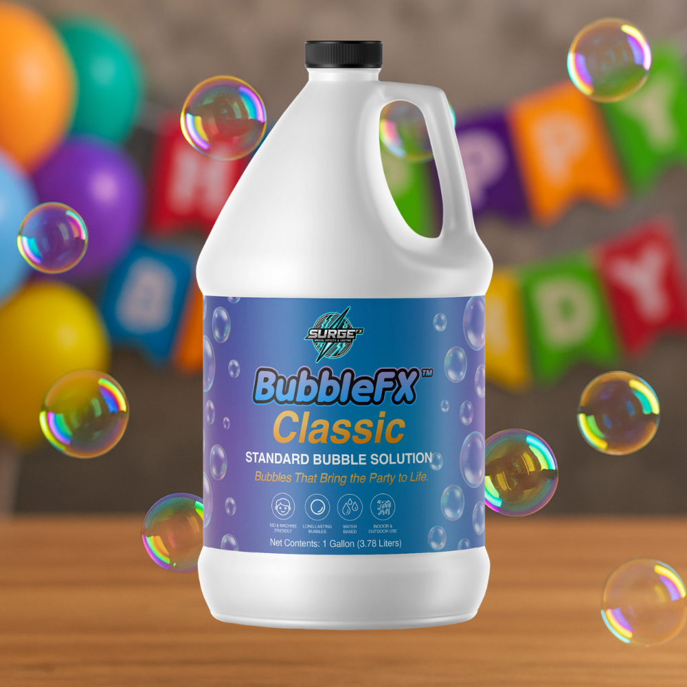 BubbleFX™ Classic is the versatile, go-to solution for high-quality bubble output at any event. Designed for everyday use, this formula produces crystal-clear, high-floating bubbles with excellent coverage and consistency. Whether you're running a foam party, a birthday celebration, or a live event, Classic delivers reliable performance in any standard bubble machine.