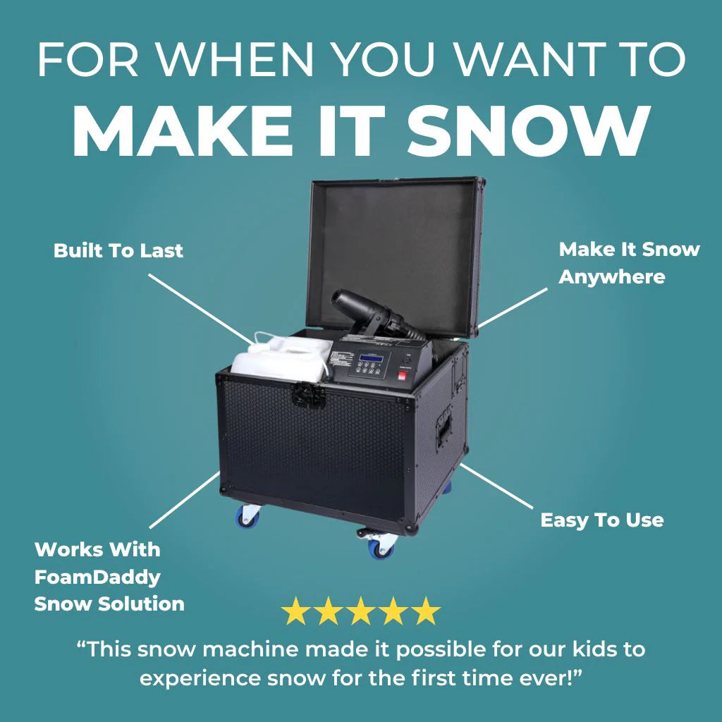 The FoamDaddy Snow Machine is a lightweight, professional snow-making device that produces artificial snow on demand. Whether you're planning a holiday party, wedding, photo shoot, or just want to surprise your kids with snow in July, this machine delivers consistent, beautiful snow output every time.