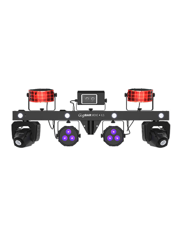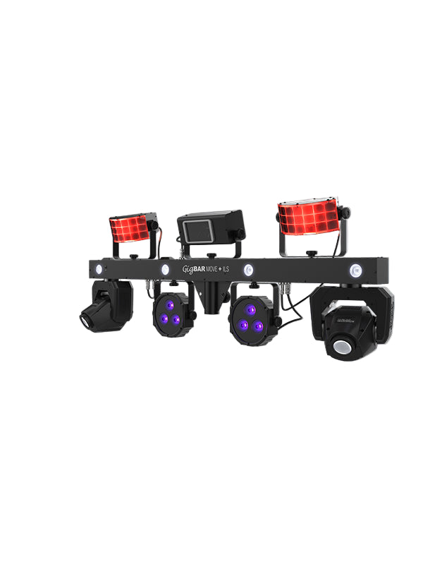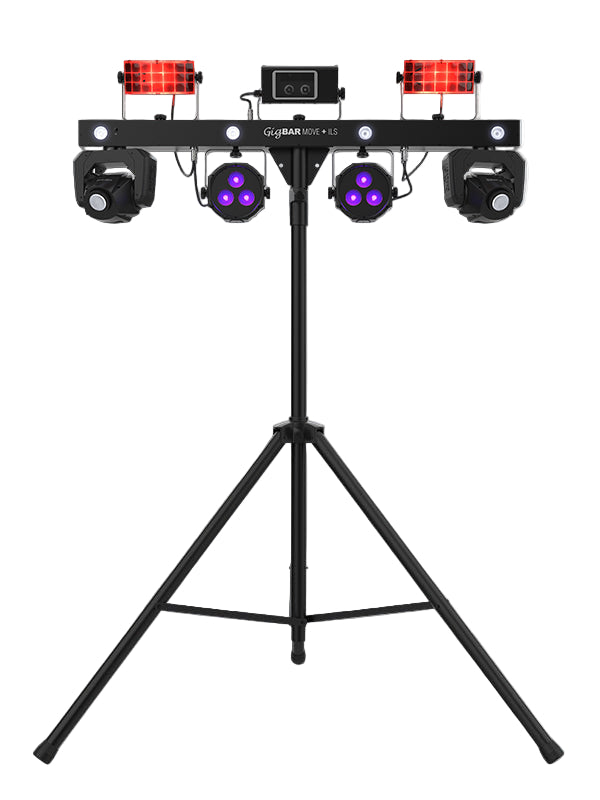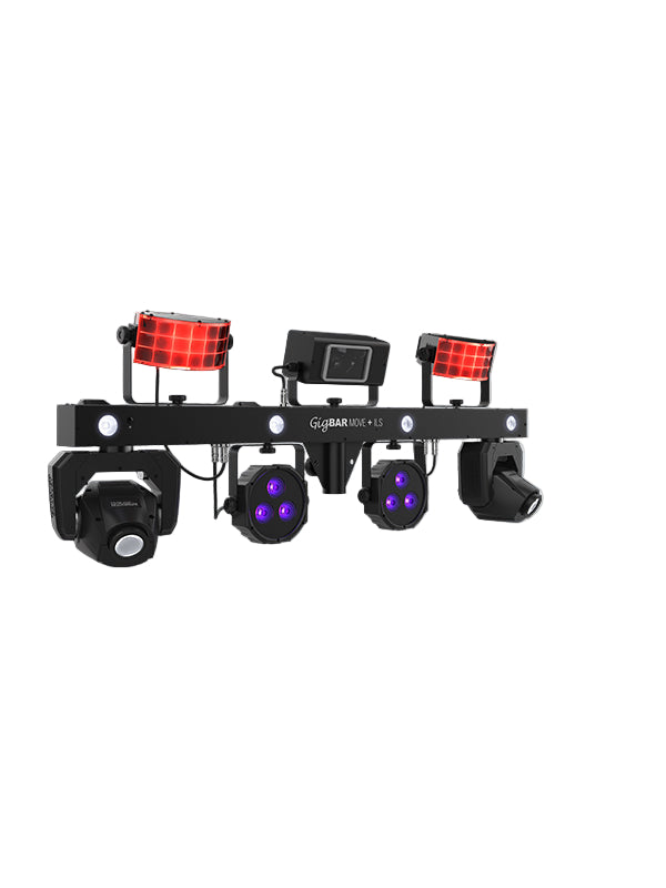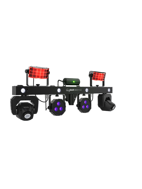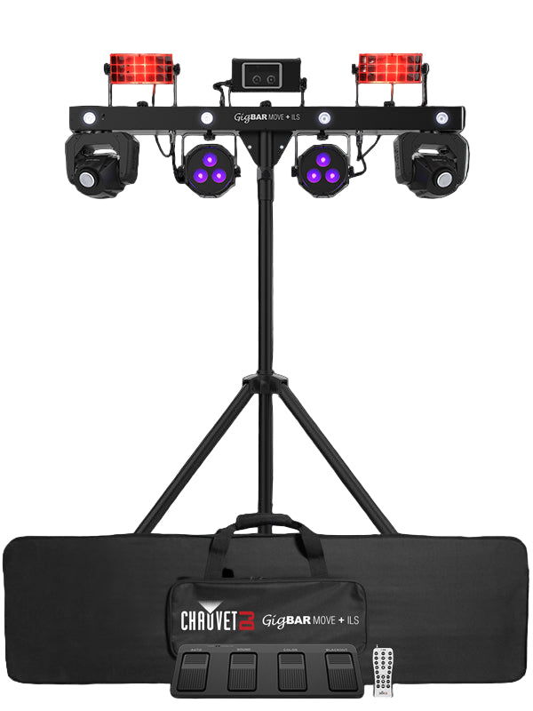 The future of easy lighting synchronization is here with GigBAR Move + ILS. GigBAR Move + ILS can control any ILS-enabled fixture, wired or wirelessly. GigBAR Move + ILS is a 5-in-1 lighting system that includes moving heads, derbies, washes, a laser and strobe effect pre-mounted on a single bar. Easy navigation and access to all the powerful 32-watt moving head functions can be accessed directly from the full-color LCD display and Totem Mode keeps the moving heads focused on the dance floor. Built-in UV LEDs illuminate florescent objects for dazzling blacklight effects. GigBAR Move + ILS gives you individual control of each effect to ensure your show looks the way you need it to, but gone is the need to aim a remote directly at the unit! The included RF remote triggers built-in shows without needing line of sight operation. Other easy control options include stand-alone mode, DMX, or wireless footswitch. The GigBAR Move + ILS package includes a tripod, wireless footswitch, RF remote and FREE carry bags to ensure quick setup.