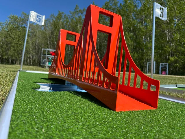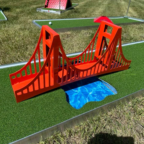 Crafted with durable aluminum and finished in a vibrant red, this iconic piece brings the charm of San Francisco right to your course. Players must skillfully putt across the bridge to sink their shot on the other side. It’s a perfect blend of challenge and visual appeal sure to be a crowd favorite at any event, rental setup, or portable mini golf course.