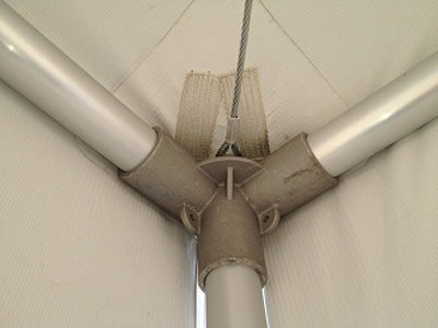 This 20'x20' high peak frame tent is set up using tension cross cables to support the center pole, no center pole on floor. This design provides a high peak elegant look and clear open floor. It also has fewer fittings and parts than traditional frame tents and pole tents, making it easier to setup and take down. A 20'x20' Marquee tent can be set up in 15 minutes with only 2 people.