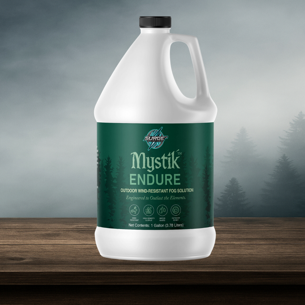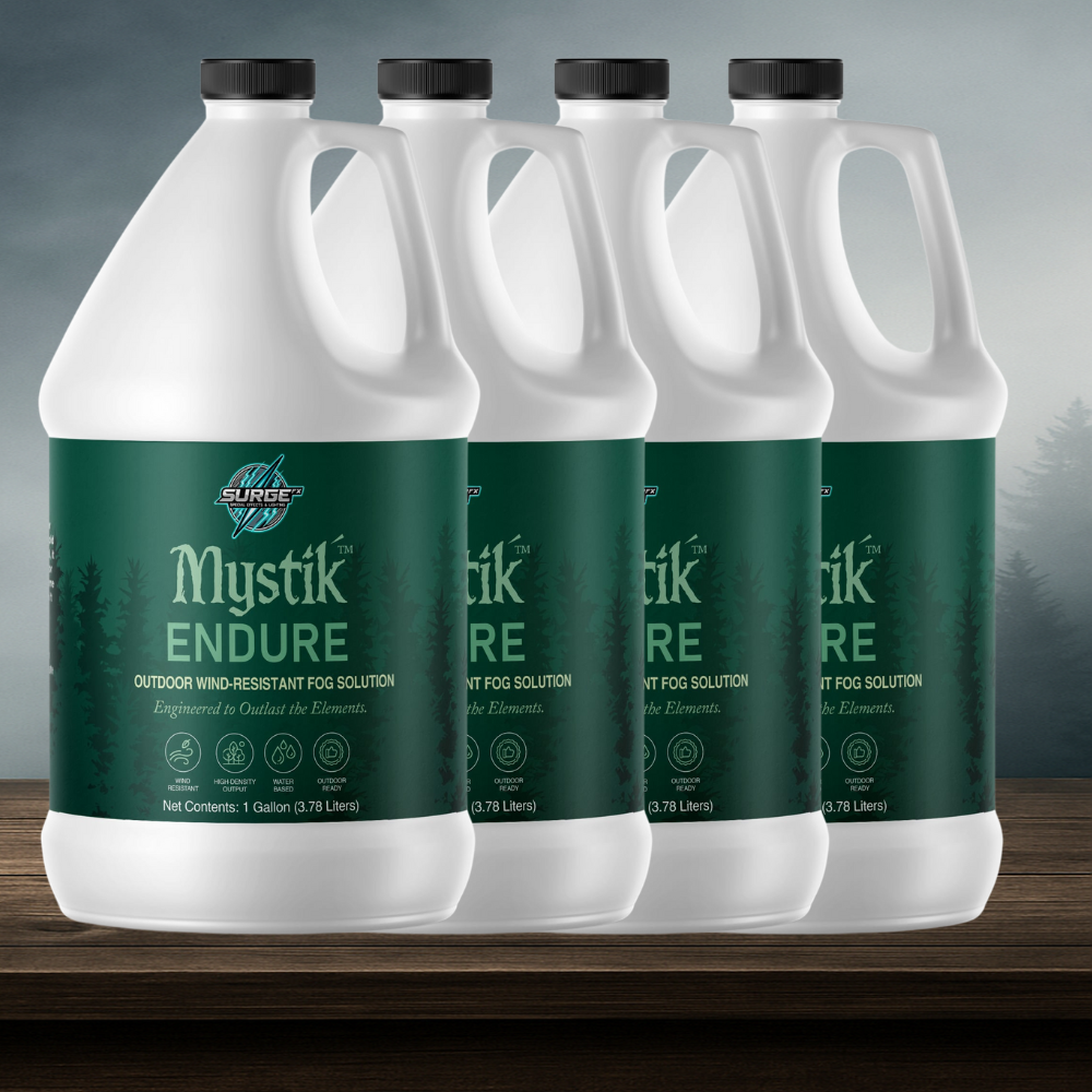 Mystik™ Endure by SurgeFX® is the go-to fog fluid for outdoor environments where visibility and wind resistance are non-negotiable. Designed for theme parks, fireworks shows, festivals, haunted trails, and large-scale events, this advanced fog solution produces thick, lingering clouds of fog that stand up to wind and stay visible longer than standard fog fluids.