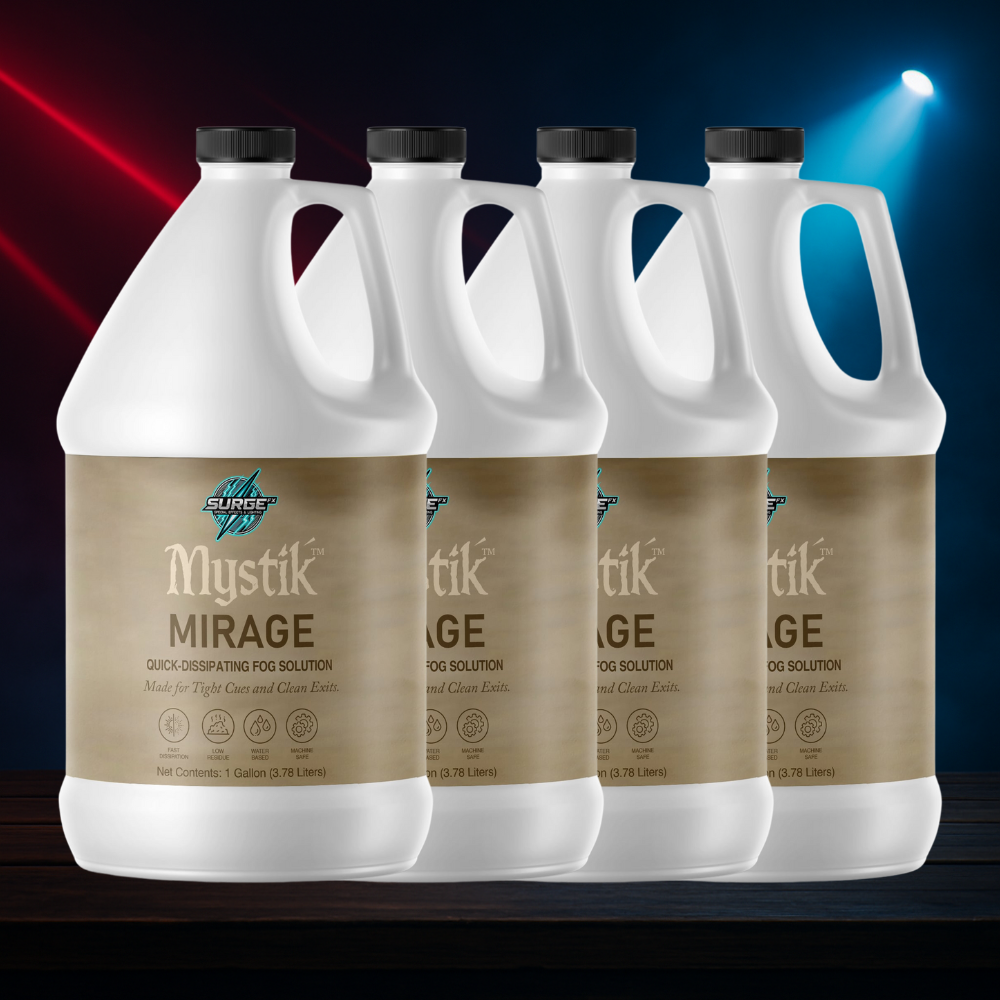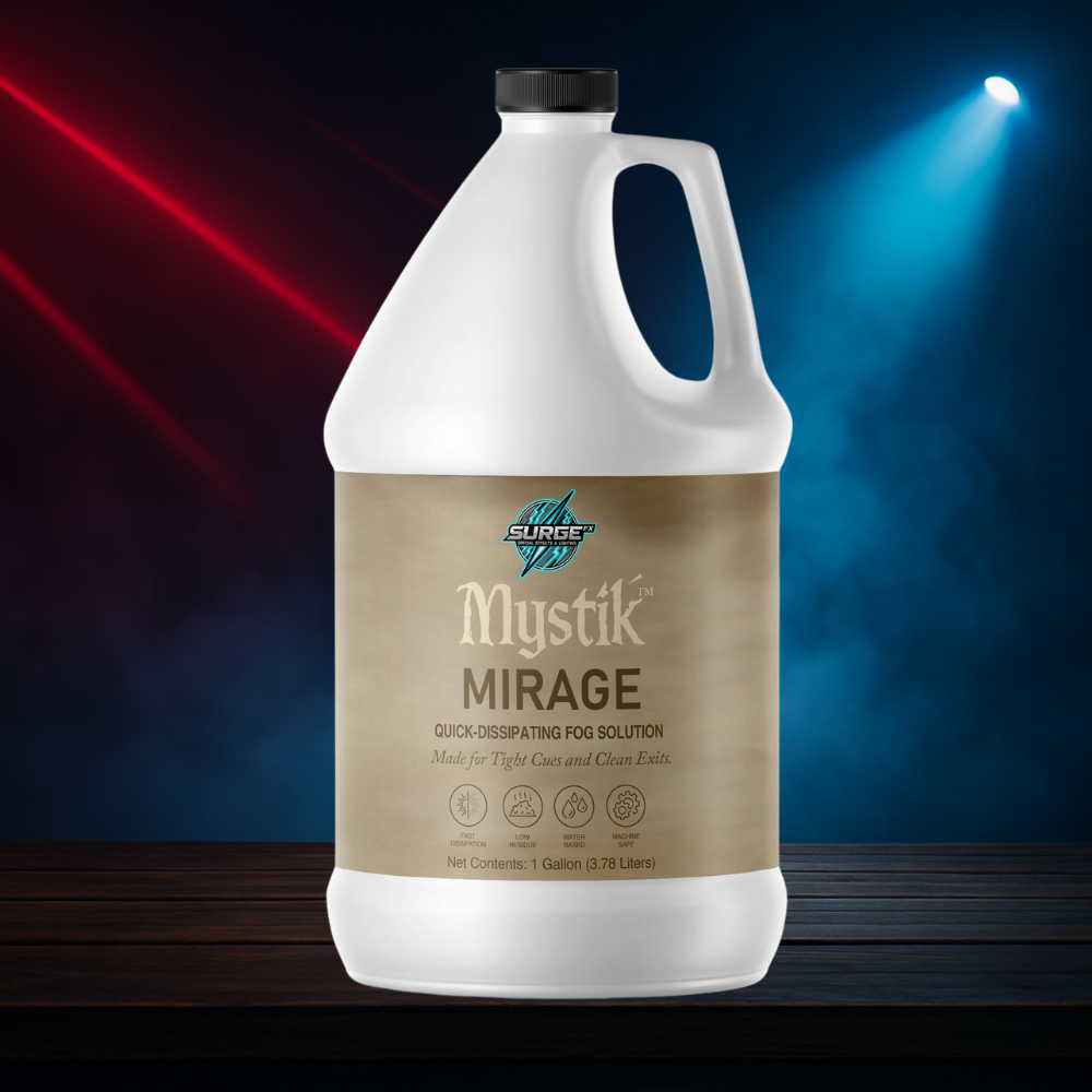 Mystik™ Mirage by SurgeFX® is a precision-engineered fog fluid designed for rapid dispersion. Ideal for DJs, theatrical productions, dance shows, and timed effects, Mirage creates a dense fog burst that vanishes fast—leaving minimal hang time and zero lingering haze. It’s perfect when fog needs to appear instantly and then clear just as fast to keep the performance in motion.