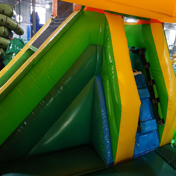 Dura Lite inflatables are constructed from 15oz mixed with 9 oz Light n StrongTM PVC Vinyl with additional vinyl reinforcement sewn in at all stress points to allow for maximum strength, durability and most importantly, safety. All seams have been double or quadruple-threaded and heat-welded for superior durability and these measures also prevent dirt and sand from damaging the seams, thus prolonging the life of your inflatable and minimizing repairs. Our bounce houses are designed with children's safety at heart, featuring finger-safe netting and safety ramp entrance that promotes more safe entry and exiting from the unit. The unit has commercial-grade webbing and Velcro throughout and zippers for easy deflation when it's time to pack up at the end of the day.
