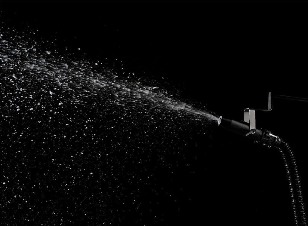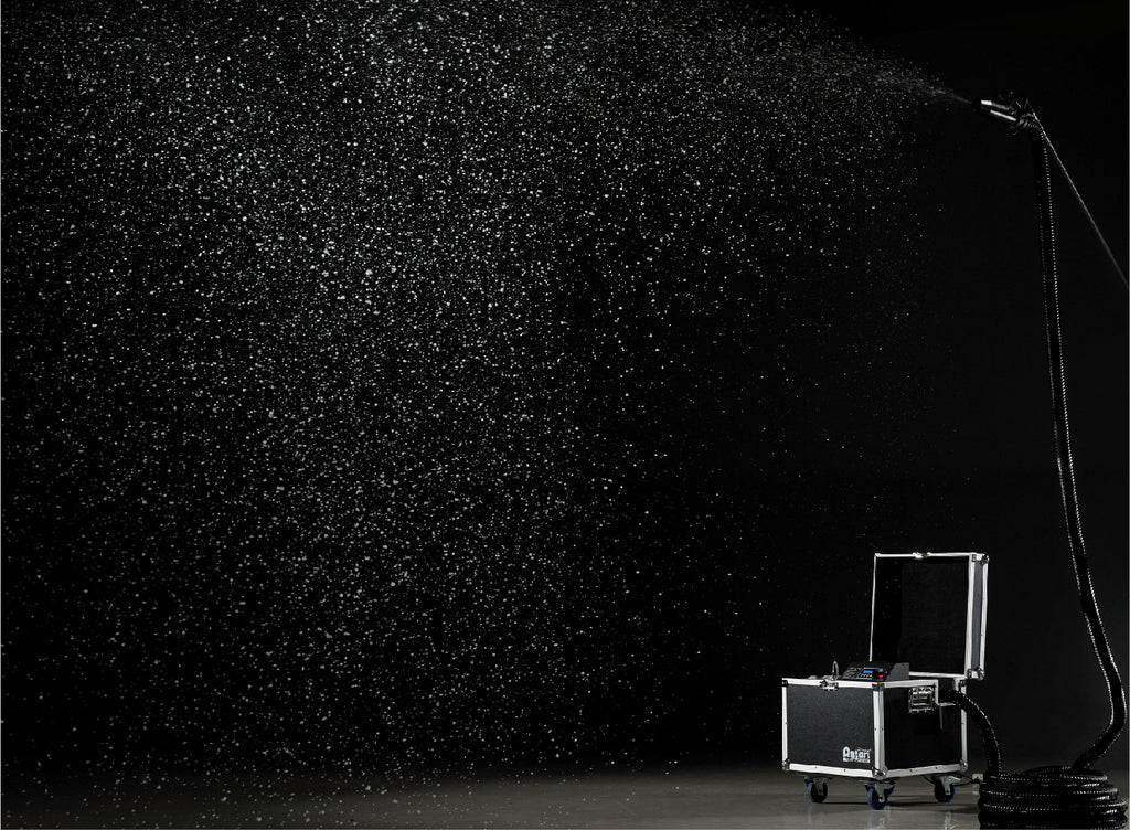 The nozzle is connected by a 10-Meter long hose and it can be easily rigged on a standard truss or tripod stand. Air and snow fluids are delivered to nozzle via the 10-Meter hose. Users can adjust the air volume and fluid flow rate to get the right snow effects needed, from fine snow to blizzards.