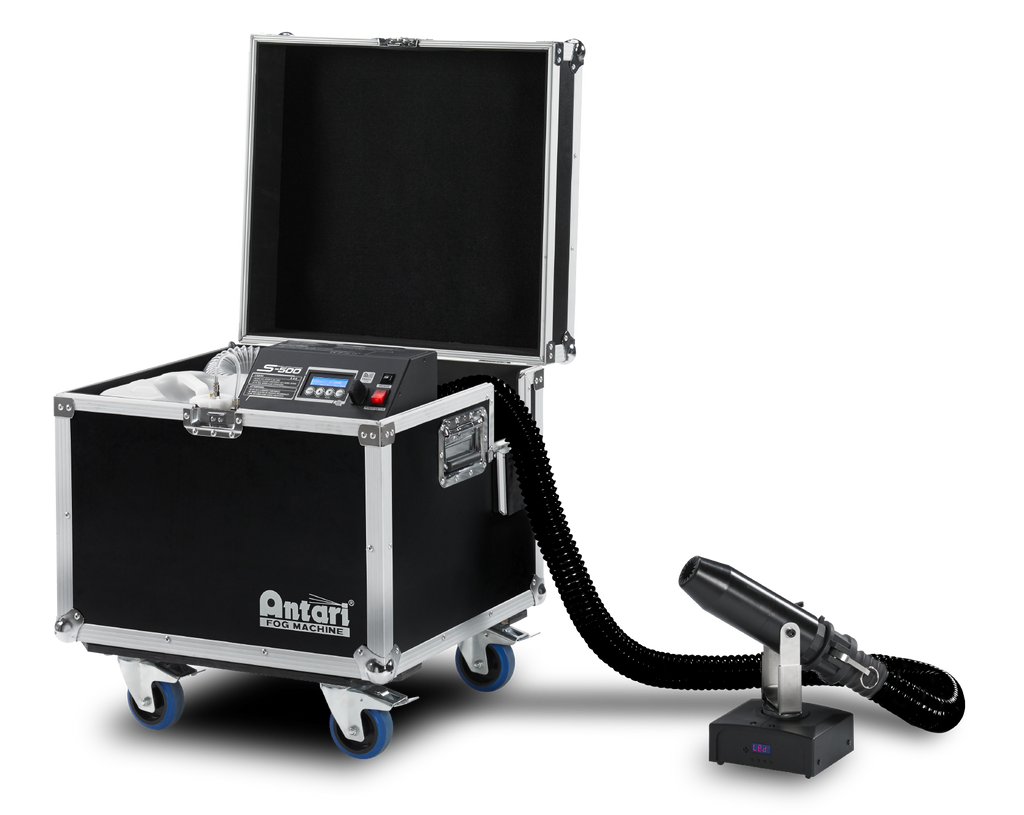 Its main body and 20-Liter fluid tank are placed inside a road case with wheels.