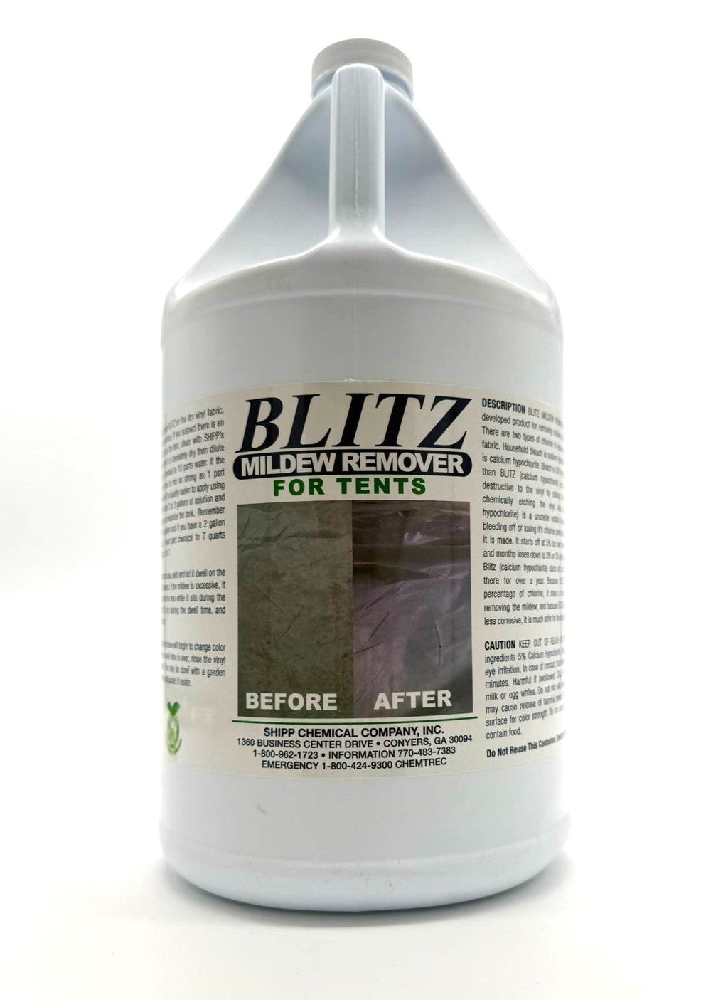 Blitz Mildew Remover for Tents and Inflatables, 1 Gallon is a uniquely developed product for removing mildew off vinyl fabric. It contains a higher percentage of chlorine than household bleach and is much more effective at removing mildew while being naturally less corrosive than bleach.