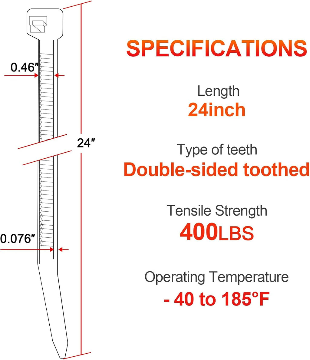24" zip ties 100 pack black, Double-sided toothed more resilient
